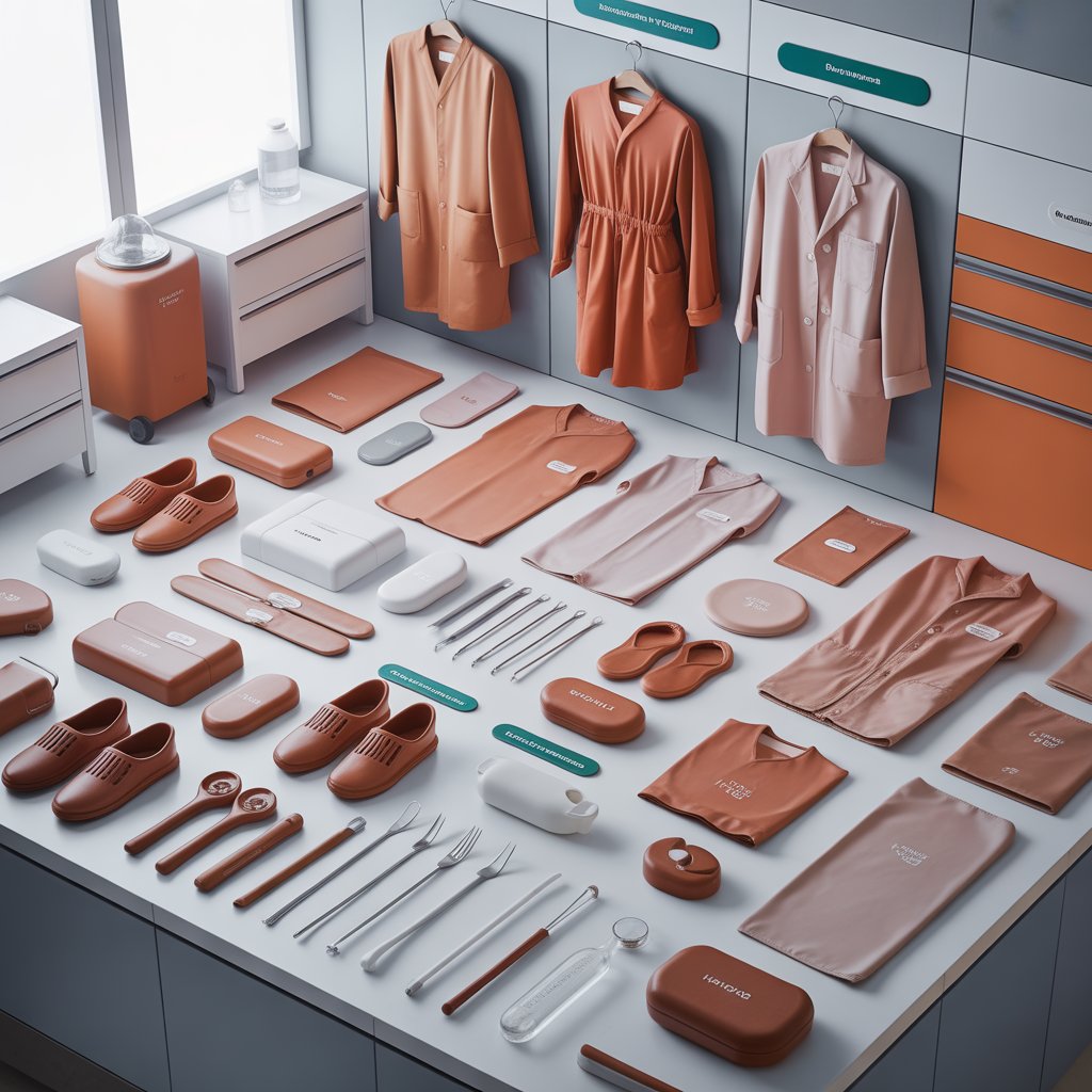 Medical Accessories of Holloware of single use, reusable, biodegradable and compositable single use, scrubs, disposable gowns, coveralls, lab coats, shoe covers and medical clinical furniture such as storage solutions for hospitals, clinics.